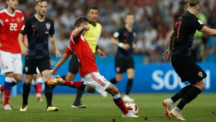 L’ailier russe a inscrit un but magnifique, d’une frappe enroulée en pleine lucarne, samedi soir lors du quart de finale de la Coupe du monde.