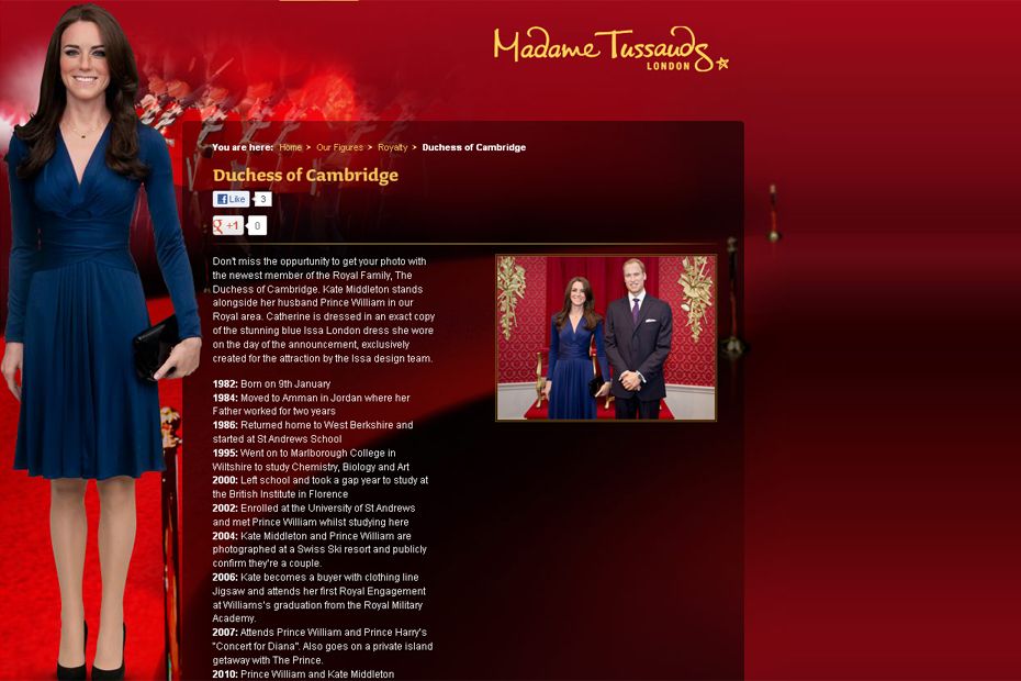 Les nouveaux mannequins du duc et de la duchesse de Cambridge s'inspirent des photos du jeune couple lors de l'annonce officielle de ses fiançailles. Catherine porte une copie de la robe bleu roi qu'elle arborait ce jour-là, recréée par Issa, et une réplique de sa bague de fiançailles ornée d'un saphir et de diamants qui appartenait auparavant à Diana, la mère de William. Le prince, deuxième dans l'ordre de succession au trône, est vêtu d'une copie du costume deux pièces bleu marine qu'il avait aussi pour l'occasion.