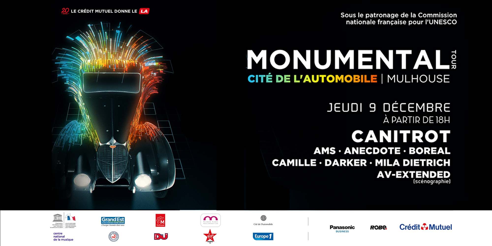 Pour ce nouveau rendez-vous du Monumental Tour, le patrimoine français va encore briller. Cette fois, le spectacle se tiendra dans la Cité de l’Automobile de Mulhouse, le plus grand musée automobile du monde. Une fois de plus, musique électronique et scénographie sur mesure sublimeront le lieu et donneront à découvrir les collections du musée sous un nouveau jour, au fil d’une déambulation lumineuse à travers le patrimoine automobile.