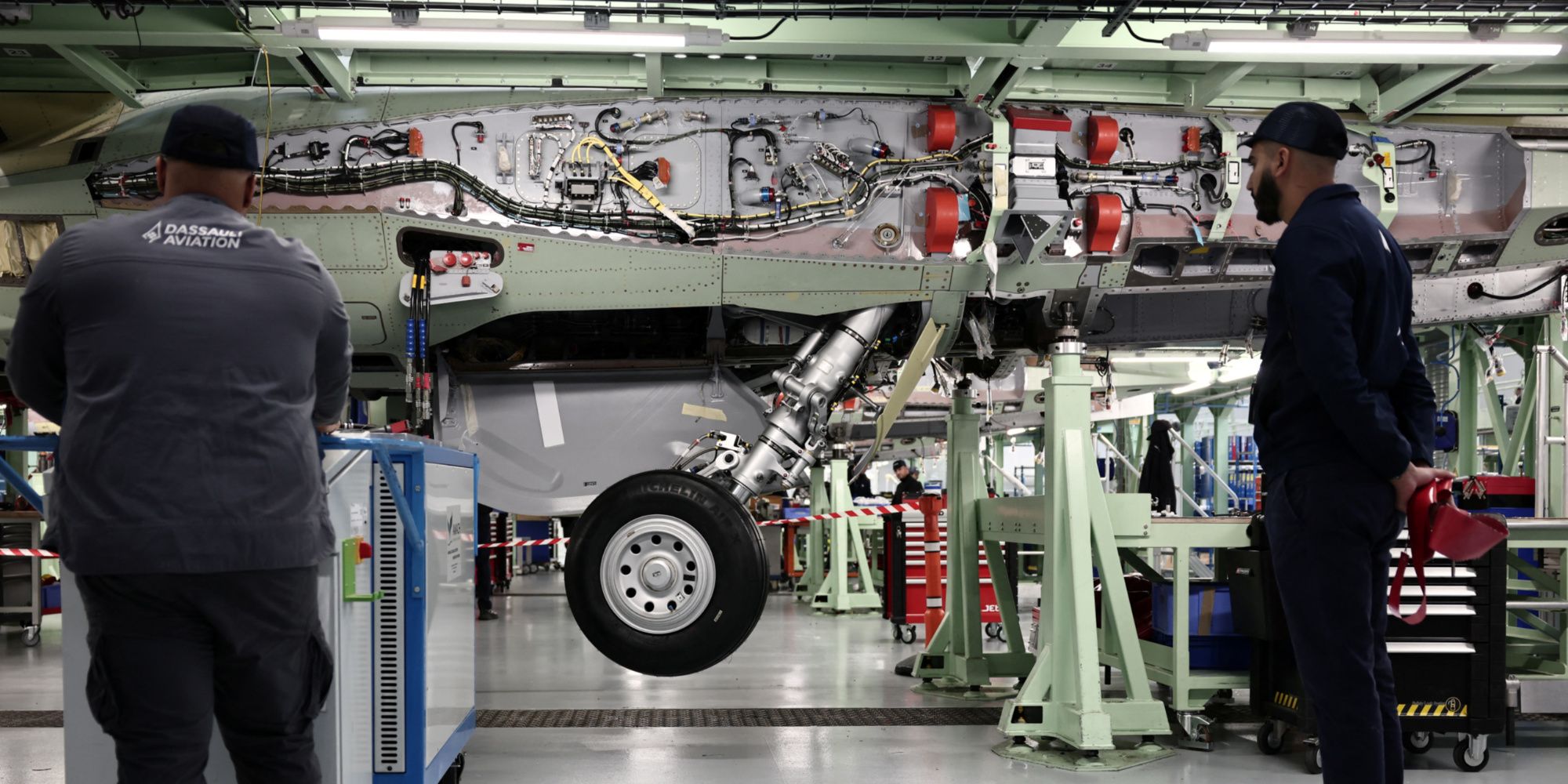 Sous la toiture blanche parsemée de tuyaux qui surplombent l'immense usine, des dizaines de "compagnons" fourmitent autour des fuselages de Rafales. Derrière son poste, un technicien est en plein test d'un train d'atterrissage. "J'allume et je monte. Je vais faire des montées-descentes de train, savoir si tout fonctionne", dit-il.