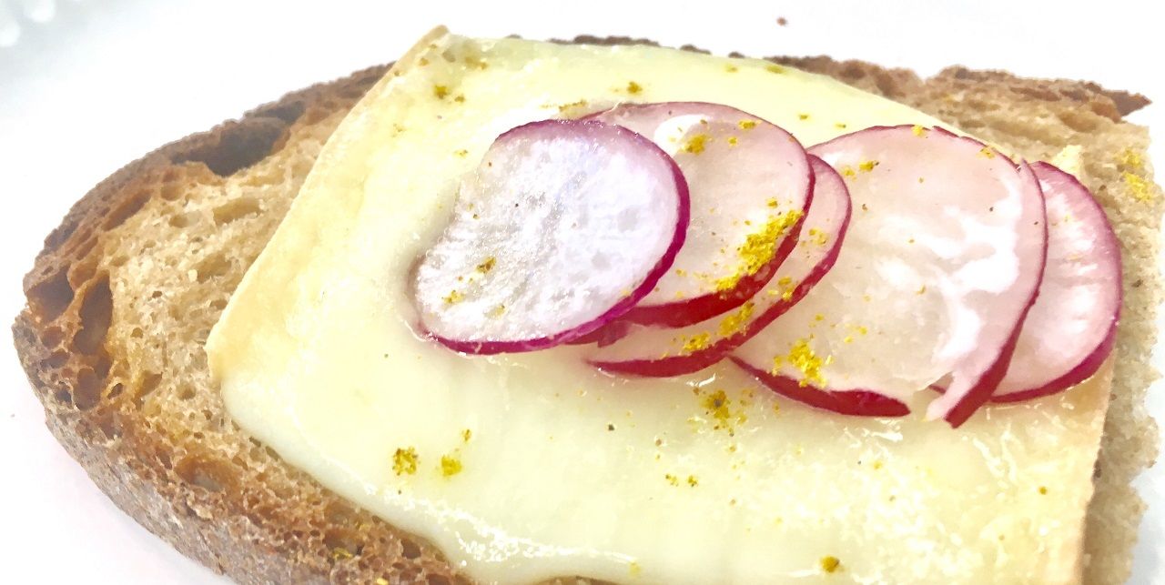 Si elles sont un peu rassies, faire toaster vos tranches de pain au grille-pain. Les couvrir de fromage et les mettre à cuire dans votre four solaire (ici, avec le Laboratoire de Cuisson Sunlab), sous réserve de météo favorable, durant le temps nécessaire à faire fondre votre fromage. Sortir du four et ajouter les radis, ainsi que le curcuma. Manger aussitôt.