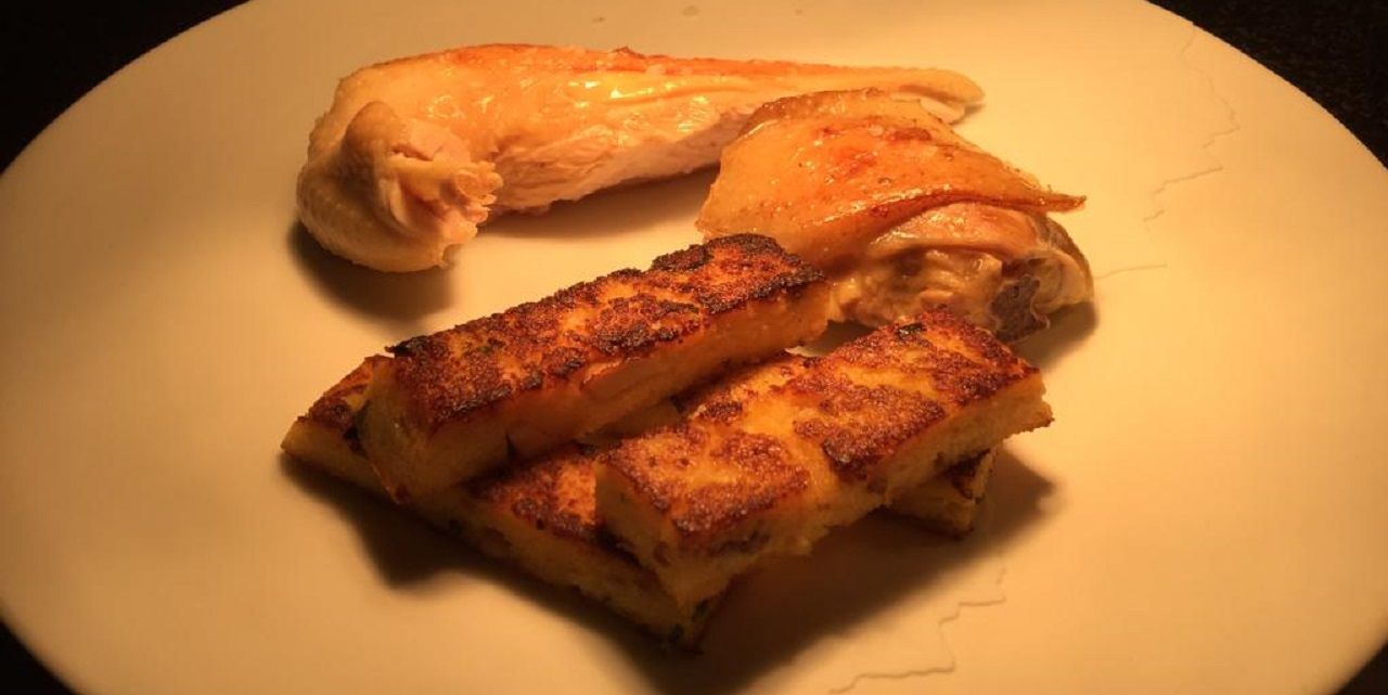 A feu moyen, faites chauffer de l'huile et du beurre, et faites dorer la volaille. Pendant ce temps-là, taillez vos frites de polenta. Faites des tronçons d'un centimètre. Ajoutez un peu de beurre clarifié dans une poêle, sur feu vif. Déposez vos frites et faites-les dorer de tous les côtés. Retournez régulièrement la volaille, pour qu'elle dore de tous les côtés... et n'hésitez pas à la caler avec des cuillères par exemple. La peau doit être croustillante