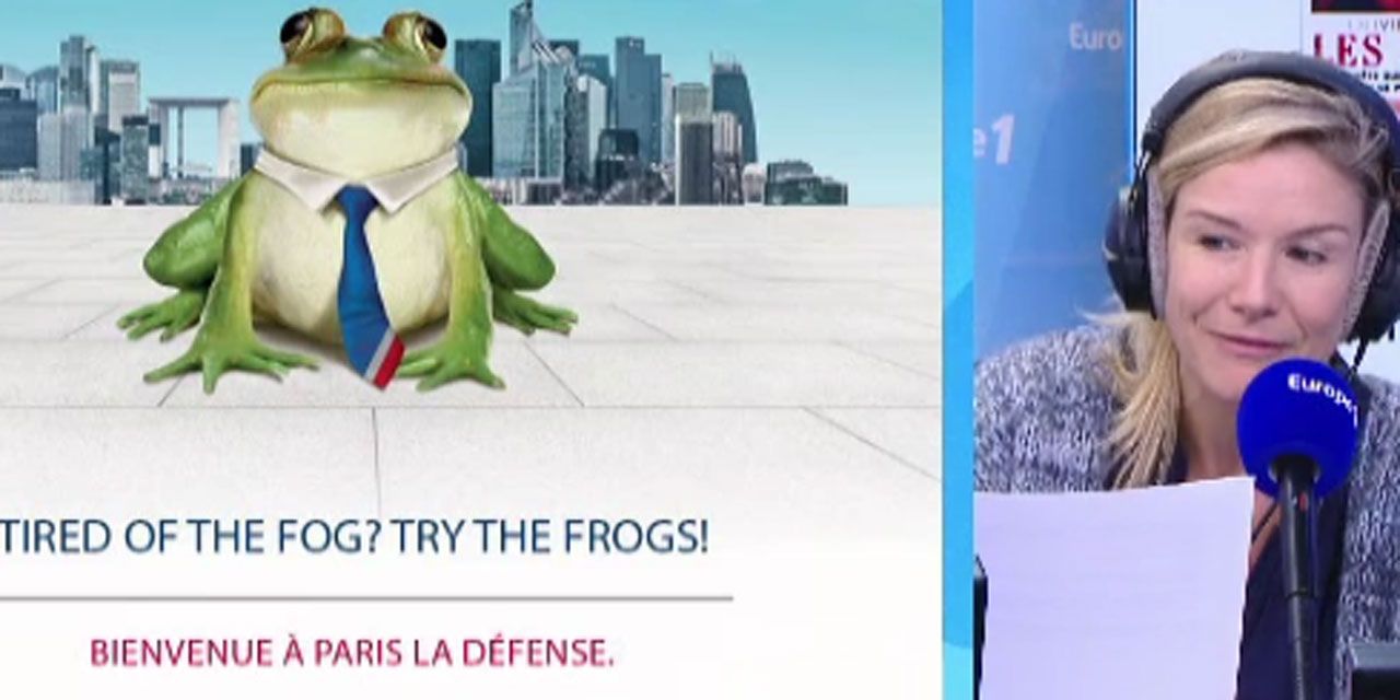 Les Français sont formidables, ils vont faire venir à Paris les entreprises Londoniennes angoissées par le Brexit ! Une campagne de publicité originale a été lancée depuis lundi. On y voit une grenouille avec une cravate bleu blanc rouge, et le slogan : "Tired of the fog ? Try the Frogs !" Soit en gros "Si vous en avez marre du brouillard londonien, essayer les grenouilles françaises !" Et venez vous installer à La Défense !