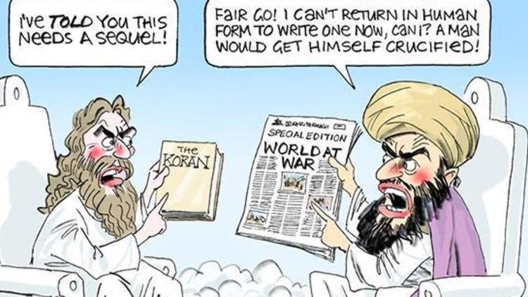 Islamic terror due to only having an Old Testament equivalent. Mohammed can't fix this b/c teh West's islamophobia. pic.twitter.com/d08b6P5lBX— Bill Leak explained (@BLeakEksplayned) 9 Janvier 2015Une "suite" au Coran. L'auteur, Bill Leak, a partagé son dessin sur Twitter. Sous ses traits de crayons, Jésus interpelle Mahomet : "Je t'avais dit qu'il avait besoin d'une suite", montrant du doigt un exemplaire du Coran. Mahomet, assis face à lui, lui rétorque alors : "Je ne peux pas revenir sous forme humaine pour en écrire une maintenant". S'il le faisait, il se ferait "crucifié", dit-il, en désignant du doigt la Une d'un journal intitulée "Le monde en guerre".