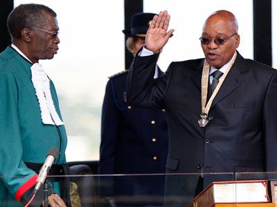Jacob Zuma a juré de "protéger tous les Sud-Africains et d'encourager le respect de leurs droits", lors de son serment d’investiture prononcé samedi devant le président de la Cour constitutionnelle Pius Langa. Le tribun zoulou chef du Congrès national africain, désigné à l’issue des élections générales du 22 avril dernier, est ainsi devenu le quatrième chef d'Etat de l'Afrique du Sud post-apartheid.