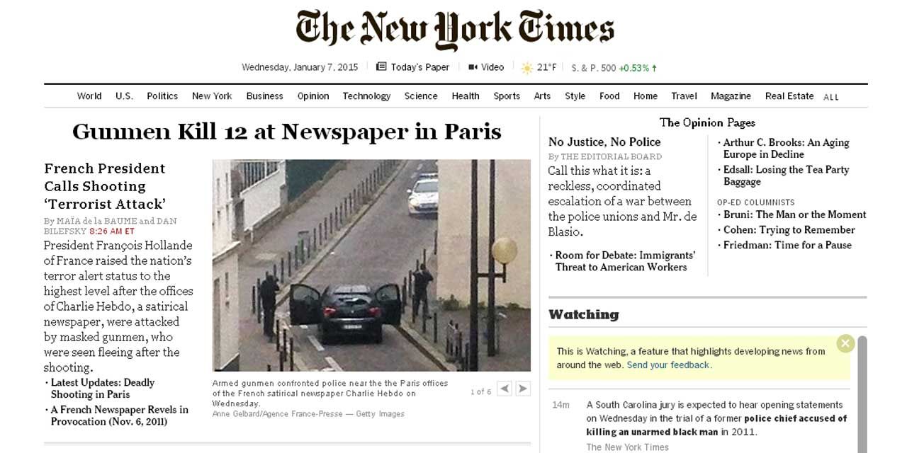"Terreur à Paris". Le New York Times , comme tous les autres grands médias étrangers se consacrent à l'attentat. "Terreur à Paris", titre en lettres capitales CNN , sur son site internet tandis que la BBC parle d'un "massacre dans les locaux d'un magazine français".