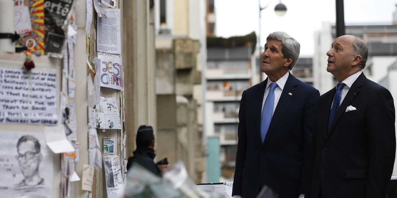 Le chef de la diplomatie américaine a déposé des gerbes de fleurs devant le supermarché casher et les locaux du journal Charlie Hebdo.