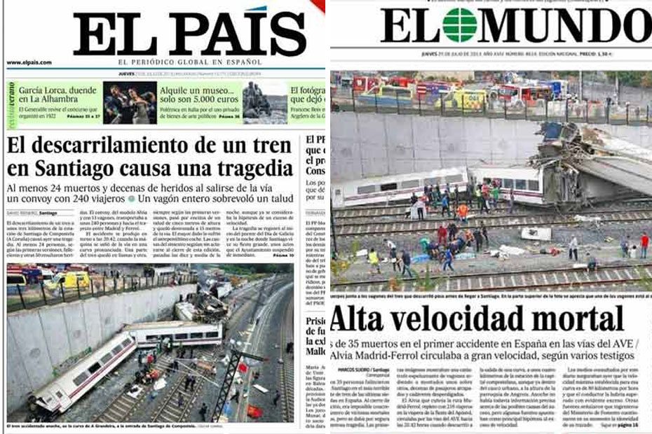 Deuxième quotidien généraliste payant le plus diffusé en Espagne, El Mundo met quant à lui l’accent sur la vitesse du train lors de l’accident. Et, comme son confrère, son bilan est erroné, avec 35 morts "seulement". Un bilan qui grandit d’heure en heure.