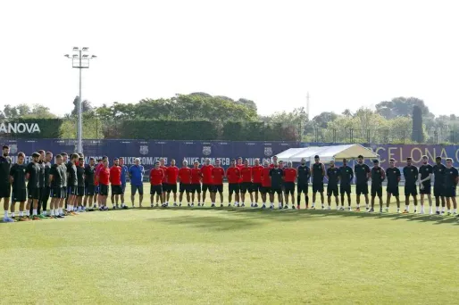 Sur une vidéo diffusée par le Barça sur Twitter, on peut voir Lionel Messi, Andres Iniesta et leurs partenaires, l'air grave, rassemblés en arc de cercle sur la pelouse du centre d'entraînement du club.