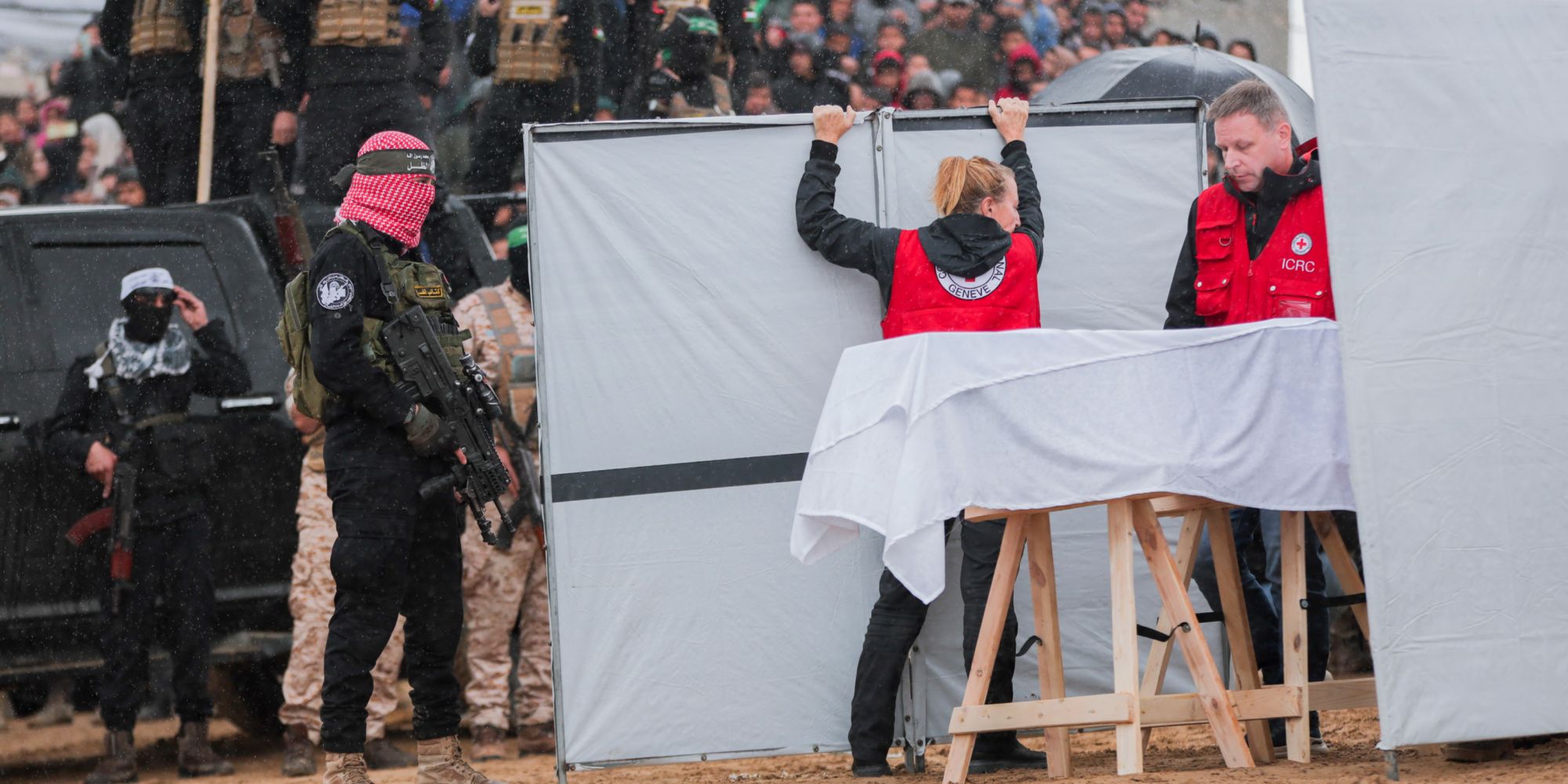 Des combattants armés et cagoulés ont exposé sur un podium quatre cercueils noirs portant chacun la photo d'un des otages. Au-dessus, un poster montrait Benjamin Netanyahu le visage maculé de sang, affublé de dents de vampire. C'était la première fois que le Hamas remettait des corps d'otages depuis le début de la guerre à Gaza, déclenchée par son attaque du 7-Octobre. Plusieurs otages morts ont été retrouvés par l'armée israélienne durant ses opérations dans le territoire palestinien.