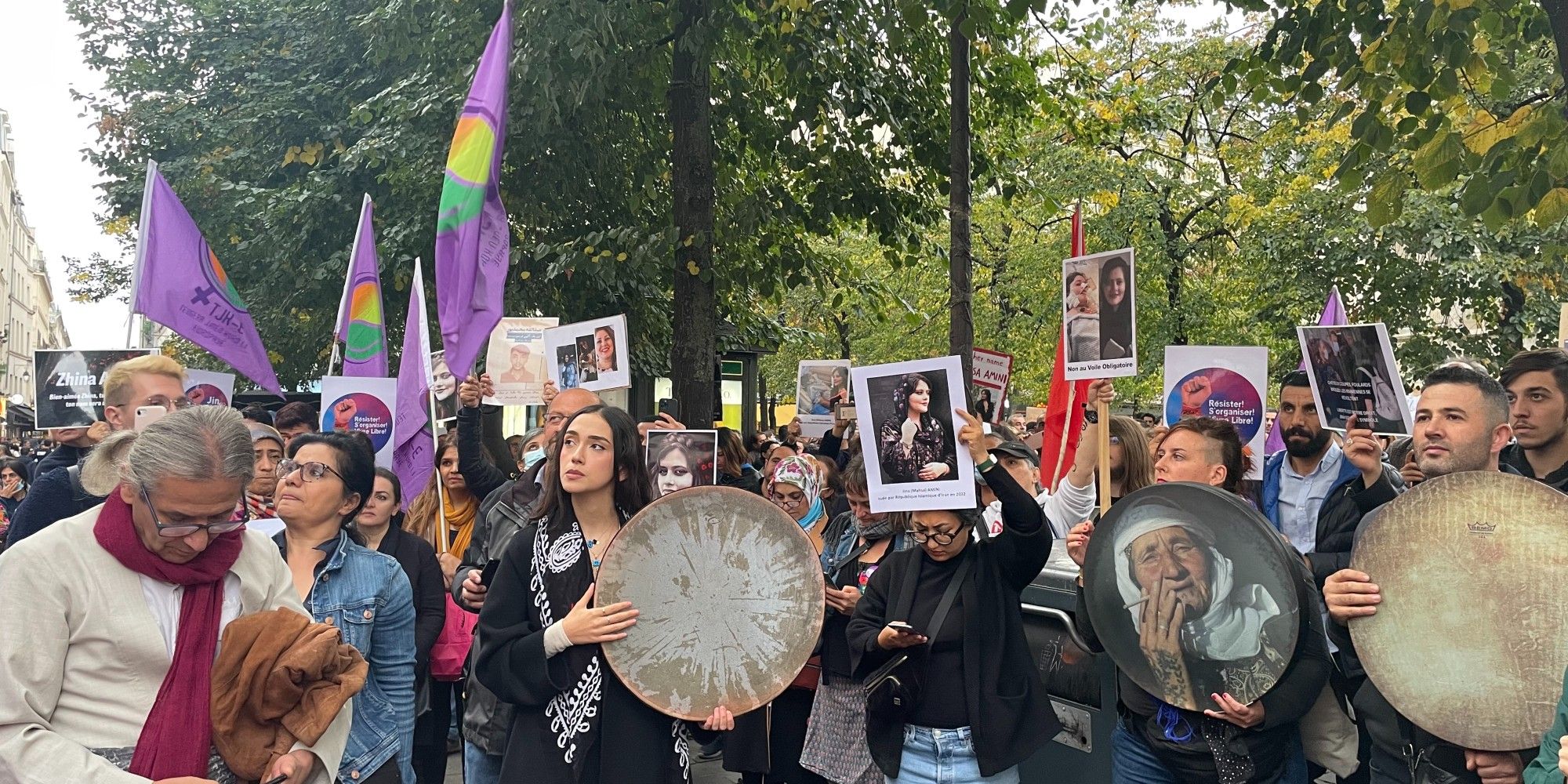 Sur place, beaucoup de drapeaux et de pancartes où il est écrit notamment "Femme, vie, liberté". Dur un grand drap blanc accroché entre deux poteaux électriques, les organisateurs ont dessiné un poing fermé, levé en l'air, symbole du soutien qu'il apporte aux femmes iraniennes explique Soma : "Il faut savoir qu'en Iran, la répression contre les femmes est super systématique. On ne peut pas être silencieuse dans cette situation là en Europe ou en exil. On essaie de vraiment être la porte-parole et aussi la voix des gens qui sont dans la rue."