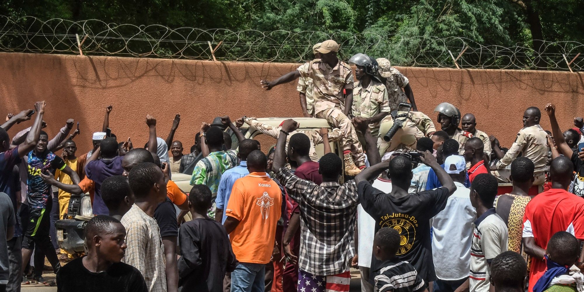 L'un des soldats, debout dans un pick-up, a salué la foule qui scandait "Russie, Russie, Russie ! ", "vive l'armée nigérienne !" et "Tiani, Tiani, Tiani !", le nom du président du Conseil national pour la sauvegarde de la patrie (CNSP, la junte), Abdourahamane Tiani. Les manifestations avaient pourtant été interdites par la junte. La France, allié du Niger pour la lutte antijihadiste et le développement, et qui y compte 1.500 soldats, a annoncé samedi suspendre ses aides. Quelques personnes se sont dirigées vers l'ambassade des États-Unis, dont le secrétaire d'État a assuré le président renversé du "soutien "indéfectible" de Washington.