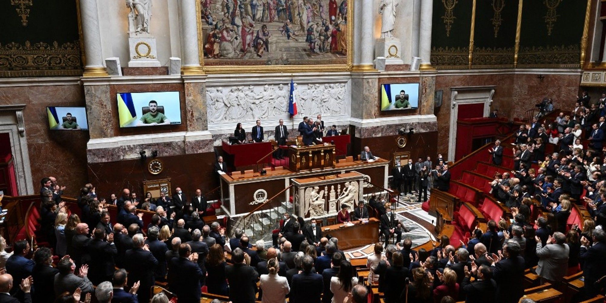 Depuis le début de la guerre en Ukraine , Volodymyr Zelensky a pris l'habitude de parler devant les parlementaires de chaque pays pour exprimer le désarroi dans lequel se trouve l'Ukraine et demander plus d'aides. Ce mercredi 23 mars, le président ukrainien avait rendez-vous avec le Parlement français. Un entretien de plusieurs dizaines de minutes durant lequel il a une nouvelle fois demandé de l'aide et appeler "la France à mettre fin à cette guerre contre la liberté" et à exercer son "leadership".