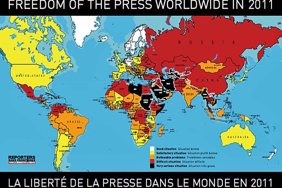 La France est classée juste derrière la Papouasie-Nouvelle Guinée, la Tanzanie, et très loin derrière la Tanzanie, 25e, ou le Chili, 33e. Sur la carte qui accompagne le Rapport de Reporters sans frontières, l’Hexagone est ainsi classé parmi les Etats présentant des "problèmes sensibles".