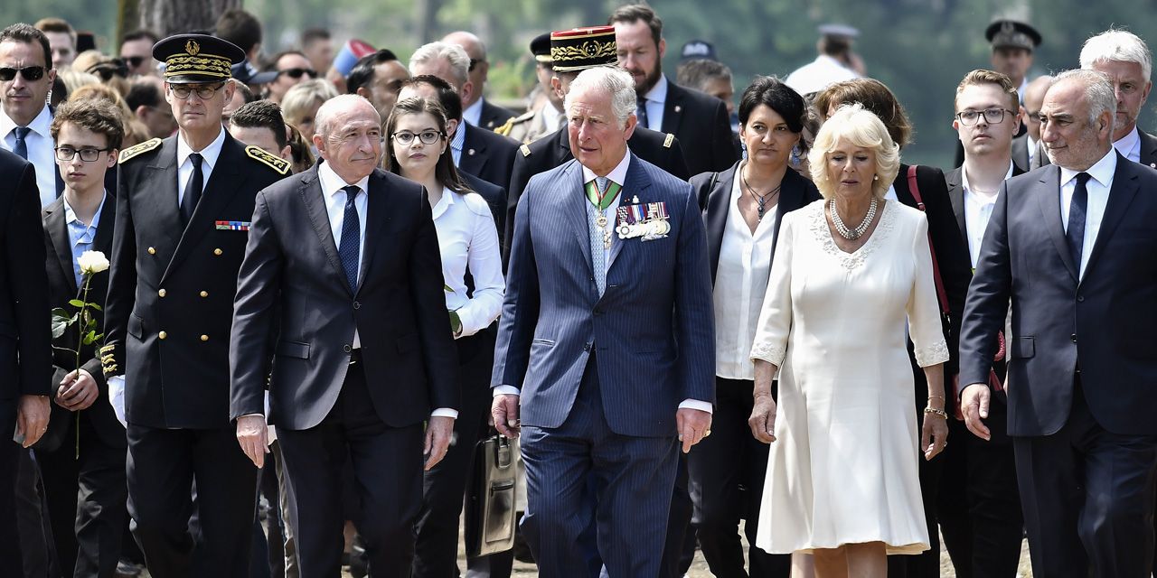 Chant et gerbe de fleurs. Mais aussi du chœur d'enfants des Petits Chanteurs de Saint-Marc, connu pour sa contribution au film Les Choristes, qui a chanté les hymnes français, britannique et européen, remercié par le prince de Galles en français. Charles, vêtu d'un costume bleu bardé de médailles, et Camilla, qui portait une robe blanc cassé, ont déposé une gerbe, accompagnés de deux lycéens, avant de se recueillir. À la fin de la cérémonie, le prince est allé serrer des mains dans le public qui avait eu accès au site sur invitation.
