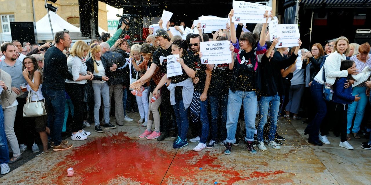 "On est chez nous !" En réponse aux slogans scandés par les militants de la cause animale, une partie des quelque 1.000 personnes qui assistaient au discours du maire, ont répondu : "On est chez nous !" Pendant environ une demi-heure, les militants ont continué à scander des slogans pendant que le maire tenait son discours, se faisant repousser par les forces de l'ordre dans une rue adjacente. "Justice pour les animaux, ni pour le FN, ni dans les frigos" ont notamment déclaré les militants de l'association "269 Life".