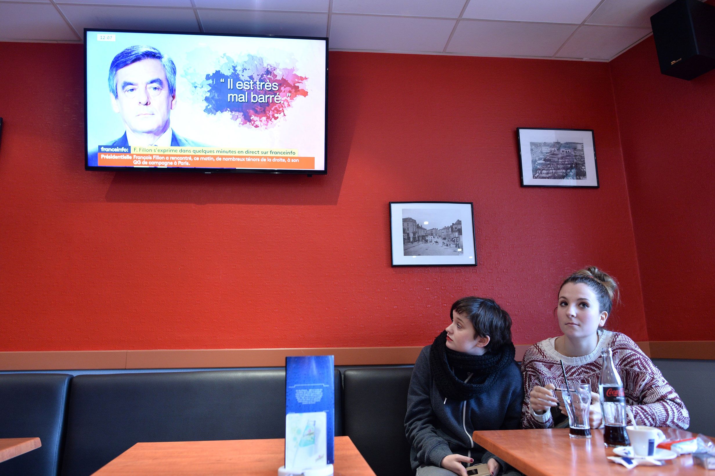 "Après le décès de Joël Le Theule, les Sarthois ont mis François Fillon sur un piédestal . Le vide sous la photo représente la descente aux enfers de l'ex-Premier ministre. Le message 'il est mal barré' (sur le téléviseur, ndlr) renforce la scène par la symétrie des lignes. On est à la campagne, dans une ville ouvrière. Le montant des salaires versés par François Fillon ou Marc Joulaud à Penelope ou à leurs enfants pour des emplois présumés fictifs et les compléments par les collectivités aux attachées parlementaires, est sans aucune commune mesure avec le quotidien de ces deux jeunes filles qui s'offrent un peu de tranquillité, avec un Coca et un café à la sortie du lycée. Je pense que la classe politique doit méditer sur la signification de cette photo car ces deux adolescentes vont voter demain… pour la première fois."