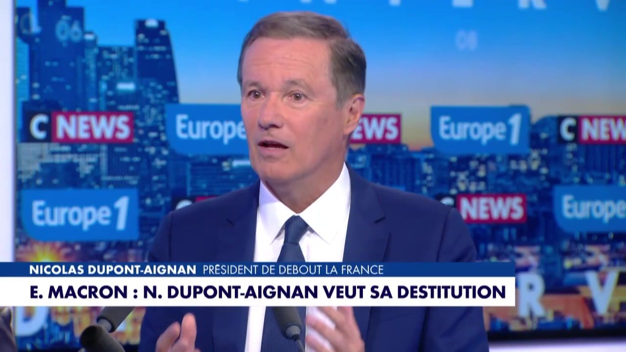 Invité de la Grande Interview de Sonia Mabrouk sur Europe 1 et CNEWS, Nicolas Dupont-Aignan a publiquement appelé à la destitution d'Emmanuel Macron et à la tenue d'une élection présidentielle. Le président de Debout la France a détaillé ce souhait.