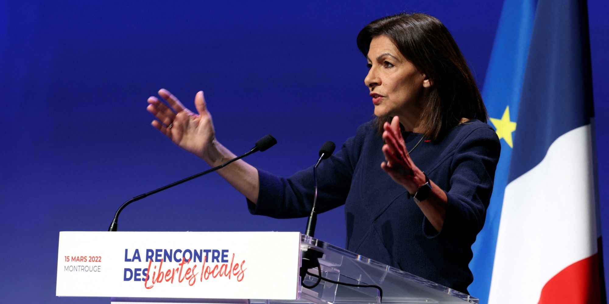 De nombreuses personnes dans le public avaient des pancartes de soutien à l'Ukraine, et l'estrade de l'oratrice portait le drapeau de ce pays, en plus des traditionnels drapeaux français et européen. Anne Hidalgo a plaidé pour le maintien de la France dans l'Otan, l'avènement d'une Europe de la Défense et un embargo sur le gaz et le pétrole russes.