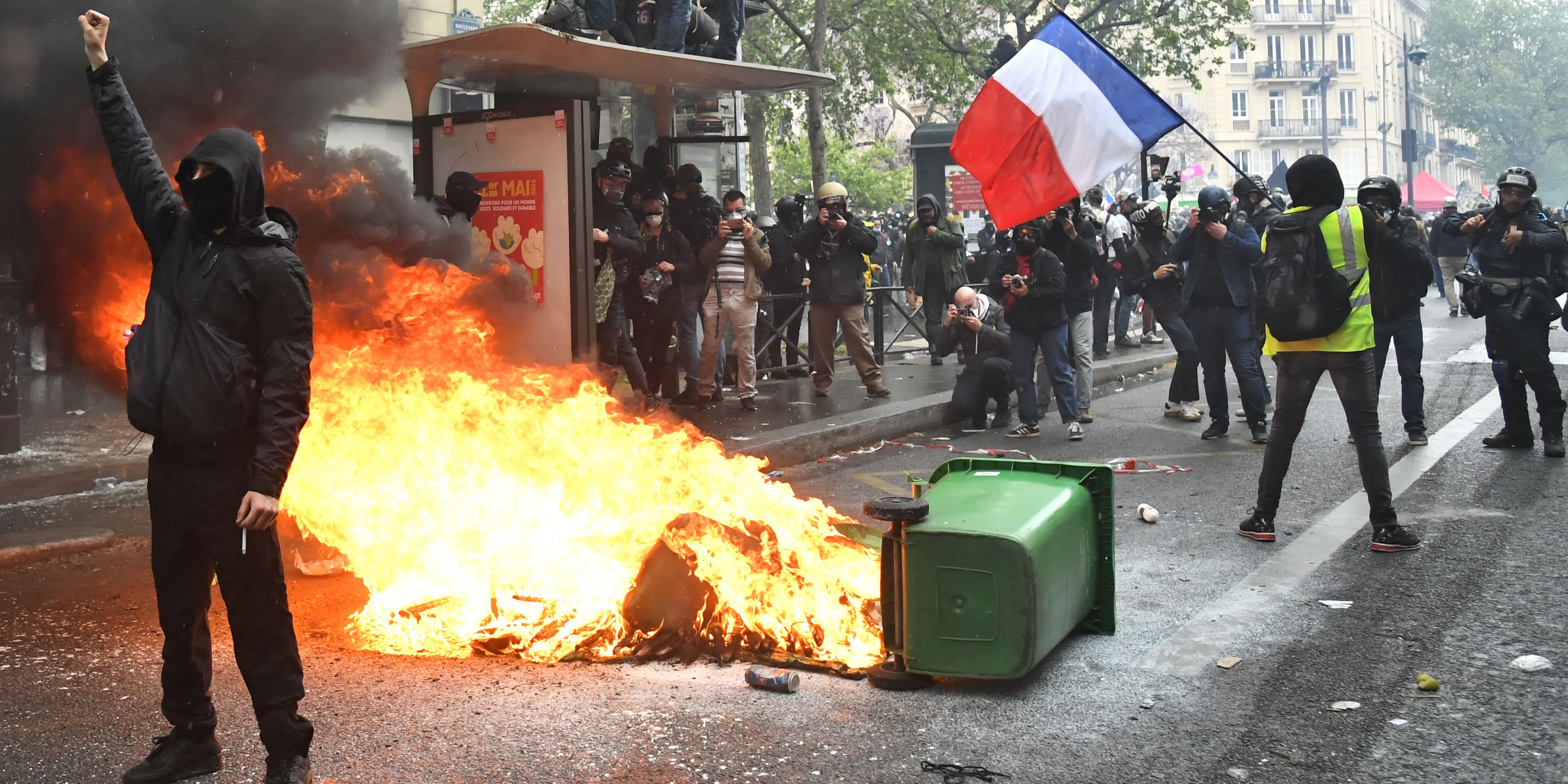 Des tensions sont rapidement apparues, avec des "tentatives répétées de constitution d'un black bloc en avant du cortège syndical" qui ont longuement bloqué les manifestants, selon une source policière. Le cortège avançait de façon sporadique. Les fauteurs de trouble étaient estimés à "quelques centaines", tandis que 5.000 policiers et gendarmes étaient mobilisés dans la capitale, de source policière. La préfecture de police a fait état de 34 interpellations. Quatorze personnes ont été placées en garde à vue, selon le parquet.
