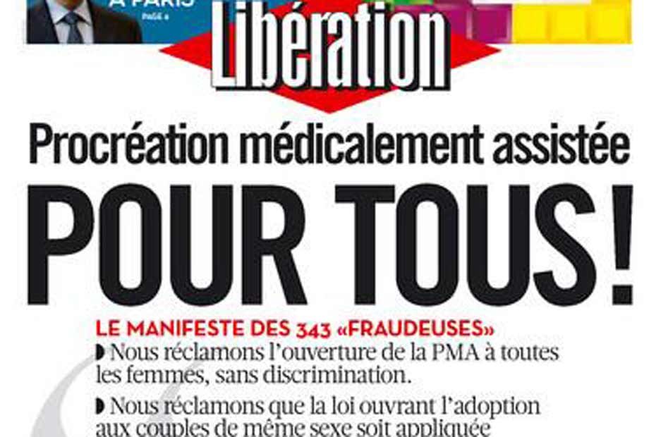A la une : Procréation médicalement assistée pour tous ! Le manifeste des 343 "fraudeuses" https://t.co/MvdUQgYFB2 pic.twitter.com/HevpgndVVl— Libération (@libe) 5 Juin 2014 Condamnées à l'exclusion. "Chaque année, des milliers de femmes ont recours à une PMA à l'étranger dans le but de fonder une famille. D'autres le font dans des conditions dangereuses pour leur santé en raison de l'exclusion à laquelle elles sont condamnées alors que la France autorise la PMA pour les couples hétérosexuels. Je déclare que je suis l'une d'elles. Je déclare avoir eu recours à une insémination avec donneur afin de fonder une famille", dit le texte du manifeste, qui réclame "l'ouverture de la PMA à toutes les femmes" et que "la loi ouvrant l'adoption aux couples de même sexe soit appliquée partout en France, sans discrimination".