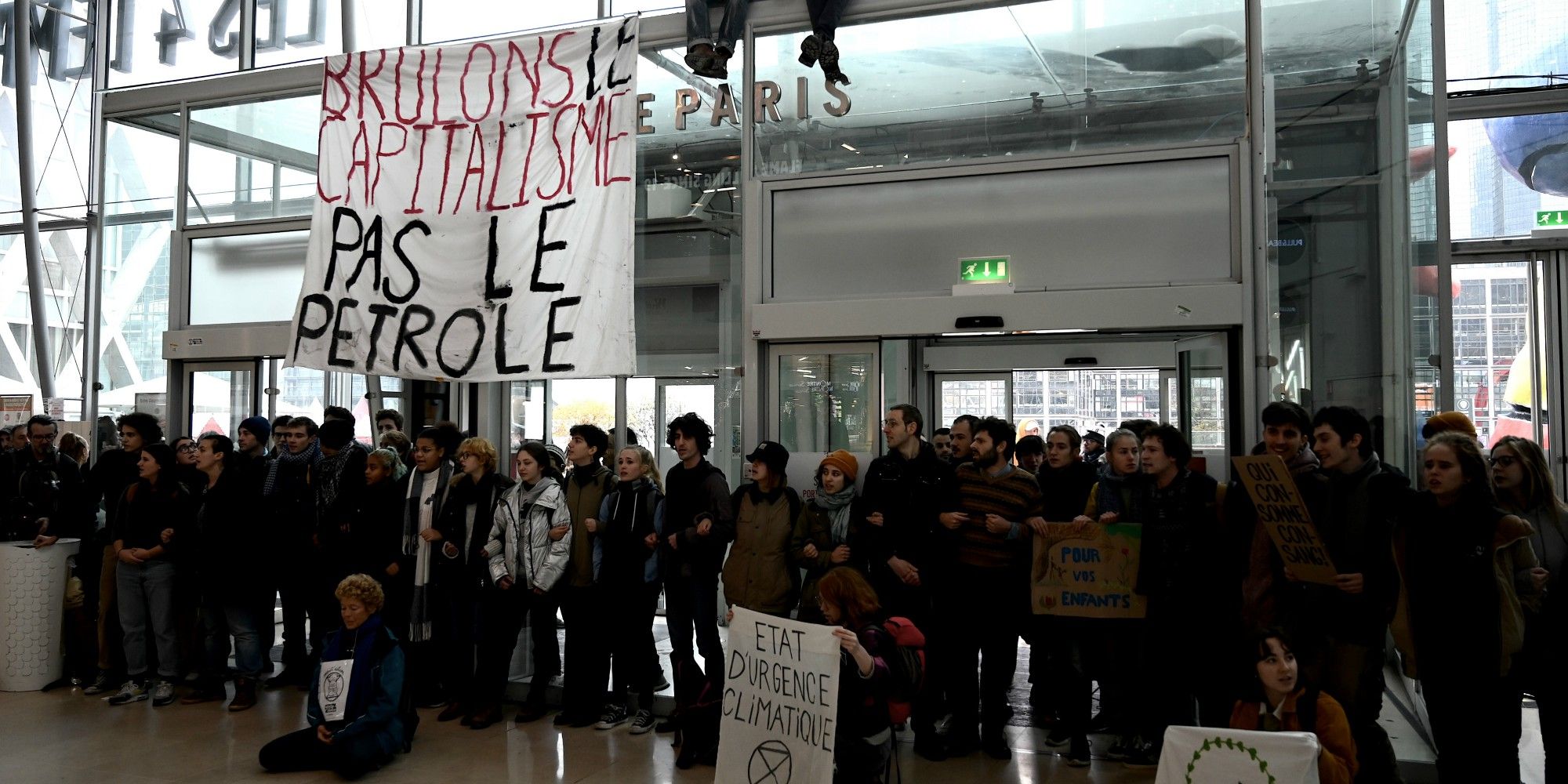 Une centaine de militants écologistes des mouvements Youth for Climate et Extinction Rébellion a mené des opérations de blocages dans le plus grand centre commercial d'Europe, à la Défense, en région parisienne, pour dénoncer la surconsommation engendré par le Black Friday.
