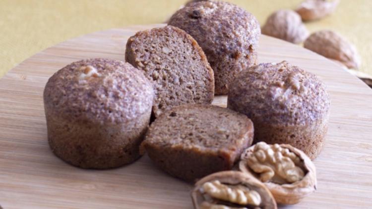 Mettez les 4 moules dans le tamis et remplissez-les de pâte (pas jusqu’en haut, car ils vont gonfler), posez 1 cerneau de noix sur chaque moelleux. Faites cuire 20 min à ébullition modérée. Soulevez le couvercle, piquez le centre d’un des moelleux avec la lame d’un couteau, elle doit ressortir propre (si besoin, prolongez la cuisson