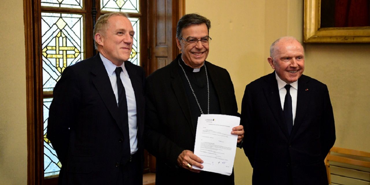 Le mécène breton François Pinault et son fils François-Henri ont signé mardi avec l'archevêque de Paris, Mgr Michel Aupetit , une convention concrétisant leur promesse de dons de 100 millions d'euros pour la restauration de Notre-Dame de Paris . En pleine forme, François Pinault a plaisanté avant d'apposer sa signature sur les documents : "Désolé, monseigneur, j'ai oublié mon carnet de chèque". "Le 15 avril, à onze heures du soir", a-t-il raconté, "on regardait les images de la cathédrale en feu, on s'est concerté et on a décidé de ce don", en soulignant qu'il avait décidé de sortir de la discrétion qui sied à ce type de geste pour "en entraîner d'autres".