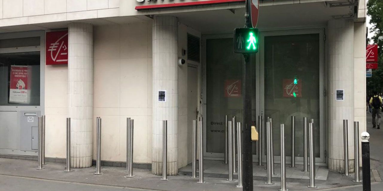 Une agence Caisse d'Épargne du 14e arrondissement de Paris avait installé des poteaux en inox devant sa vitrine pour empêcher un sans-abri de s'y installer.