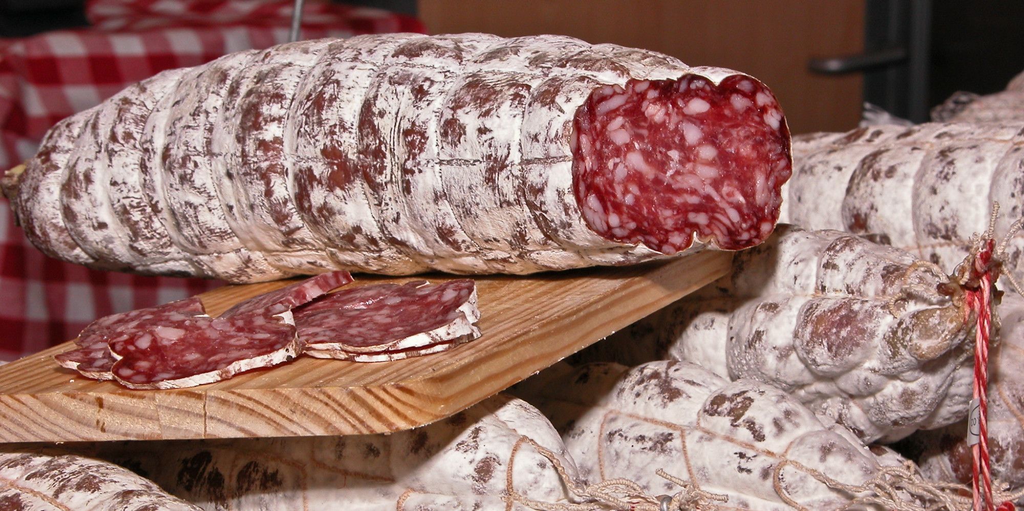 Il y a du cochon, bien entendu. Traditionnellement, le saucisson de Lyon est fait avec un mélange de viande, comme du porc et de l'âne par exemple. Aujourd'hui, il est fait à 100% avec du porc, haché très finement.