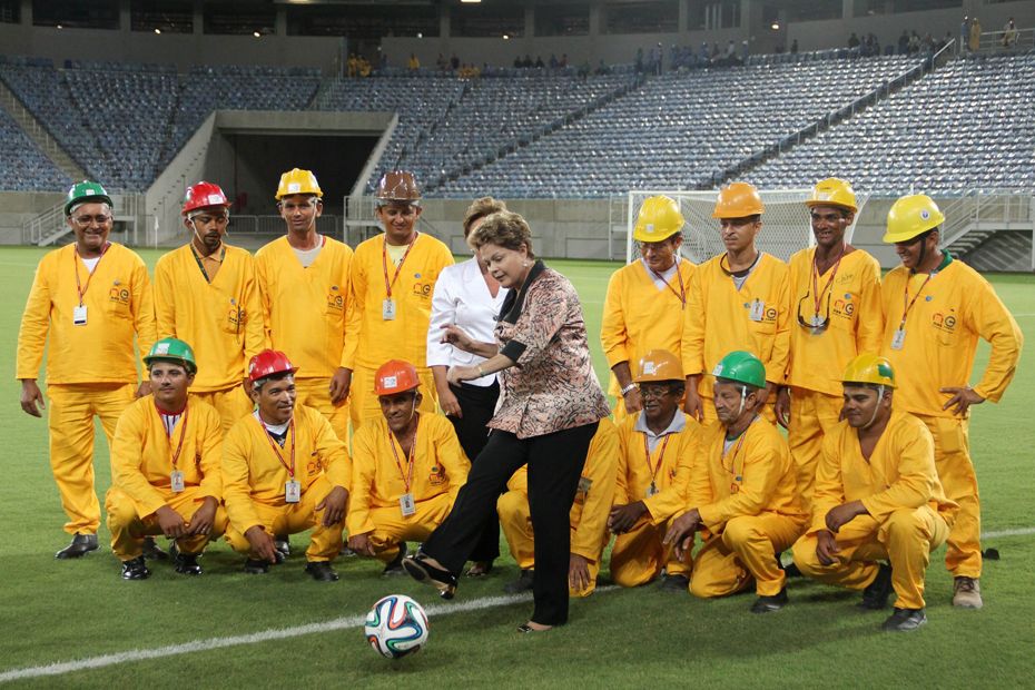 Le Brésil est le pays du football. Et quand il s'agit de taquiner la sphère, la première des Brésiliens s'y plie elle aussi de bonne grâce. La présidente Dilma Rousseff a inauguré jeudi le stade de Natal, dans le nord du pays, entourée d'une quinzaine d'ouvriers. Il s'agit de la septième enceinte (sur douze) déjà livrées pour la Coupe du monde. A l'origine, la fédération internationale (Fifa) avait demandé à ce que tous les stades soient achevés au 31 décembre dernier afin d'avoir le temps d'y effectuer les tests nécessaires. Cette inauguration s'est faite en présence du secrétaire général de la Fifa, Jérôme Valcke, qui, la veille, avait critiqué les retards pris dans les travaux à Curitiba. Le Français avait même espéré que la situation évolue rapidement "pour que Curitiba ne se retrouve pas exclue de la Coupe".
