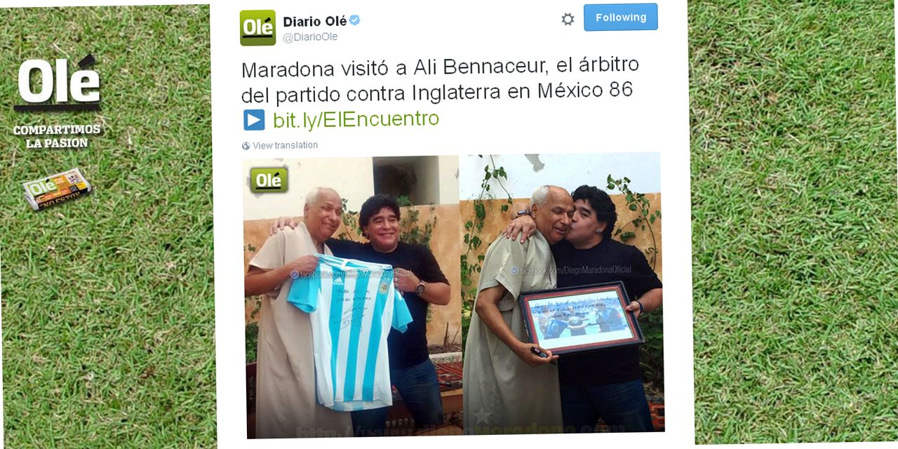 C'est l'une des erreurs arbitrales les plus légendaires de l'histoire du football. Le 22 juin 1986, le Tunisien Ali Bennaceur n'avait pas sifflé la main qui avait permis à Diego Maradona de tromper Peter Shilton lors du quart de finale du Mondial entre l'Argentine et l'Angleterre, au stade Aztèque de Mexico. Près de trois décennies plus tard, l'ancien stratège de l'Albiceleste a rendu visite à celui qui n'avait pas vu la "main de Dieu".