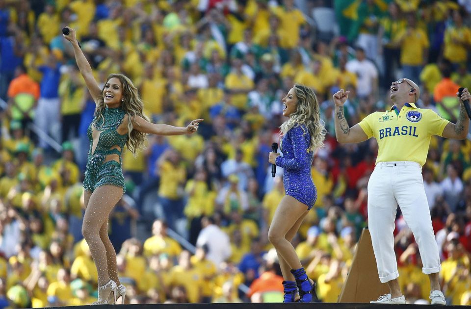La cérémonie s'est achevée sur l'hymne du Mondial "We are one", interprétée par le superstar américaine Jennifer Lopez, la Brésilienne Christine Leitte et le rappeur Pitbull, qui portait le maillot du Brésil, comme la grande majorité des spectateurs. Le trio était accompagné par les Tambours afro-brésiliens d'Olodum.