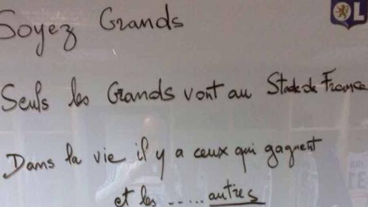 Les Lyonnais ont assuré l'essentiel, mercredi soir en demi-finale de la Coupe de la Ligue. En battant Troyes (2-1) à Gerland, les Gones défieront le PSG, le 19 avril prochain au Stade de France. Après la rencontre, le capitaine de l'OL, Milan Bisevac , a dévoilé le mot laissé dans les vestiaires par le président Jean-Michel Aulas. "JMA" a utilisé la bonne vieille méthode des grandes phrases (pompeuses) sur le tableau blanc. Un classique qui a bien fonctionné.