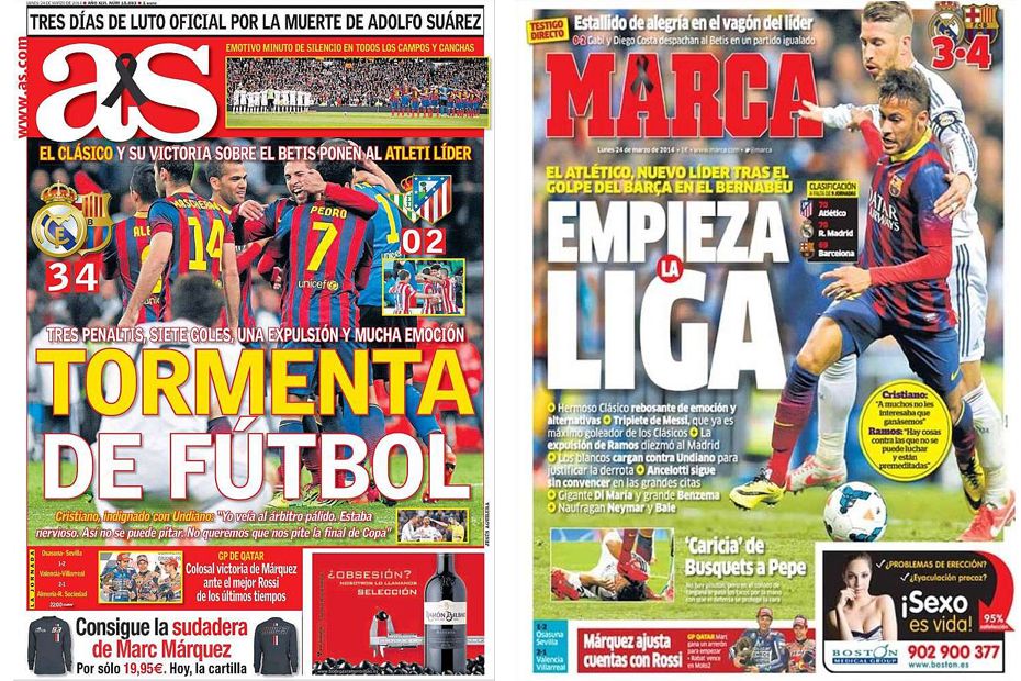 Impossible de résister, dimanche, à la qualité et à l'intensité du clasico entre le Real Madrid et le FC Barcelone (3-4). Le quotidien madrilène As résume le sentiment général d'un simple "Tempête de football", avec "trois penalties, sept buts, une exclusion et beaucoup d'émotion". Son concurrent, Marca, préfère retenir le suspense relancé en haut du tableau : "le championnat commence", dit la Une , avec une photo du contact entre Sergio Ramos et Neymar, qui a occasionné le premier des deux penalties du Barça et l'exclusion du défenseur espagnol.