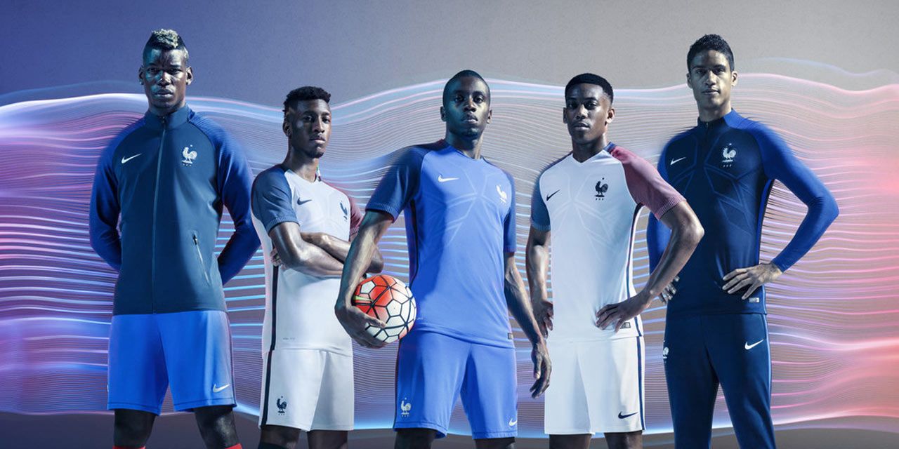 L'équipe de France a dévoilé ses nouvelles tenues Nike pour l'Euro 2016. La tunique domicile est bleue, avec une nuance plus sombre sur les épaules, alors que le maillot extérieur est blanc, orné de bleu et de rouge.