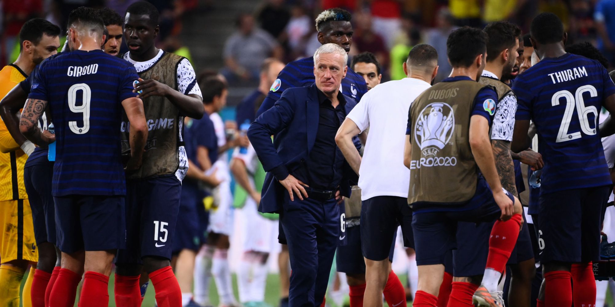 Malgré l'avance de deux buts prise par les Bleus, alors revenus dans un schéma classique, les défenseurs centraux Raphaël Varane et Presnel Kimpembe ont tour à tour perdu leur duel dans la surface de réparation, et laissé les Suisses égaliser au terme des 90 minutes. Signe de la fébrilité de l'équipe de France : les Bleus ont encaissé trois buts, dont l'un annulé pour une position de hors-jeu, dans les dix dernières minutes. Un relâchement fatal à ce niveau de compétition.