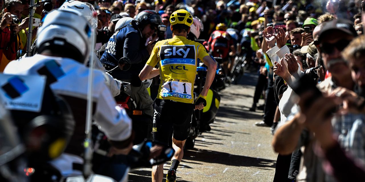 Jeudi 14 juillet, 12ème étape : à pied dans le Ventoux. Cela restera à coup sûr comme l'image de ce Tour 2016 : un Maillot Jaune à pied, dans le Mont Ventoux. Saisi de panique après avoir été pris dans une chute provoqué par le coup de frein d'une moto, le coureur de la Sky se met à courir au milieu des spectateurs , à un peu plus d'un kilomètre de l'arrivée. Après avoir grimpé sur un vélo de dépannage, pas adapté, puis un deuxième, le leader du classement général perd près de deux minutes sur ses rivaux. Mais, après une heure de délibération, le jury des commissaires décide finalement de le classer dans le même temps que Bauke Mollema, premier des trois coureurs victimes de la chute à franchir la ligne d'arrivée fixée au niveau du Chalet Reynard, six kilomètres en aval du sommet.